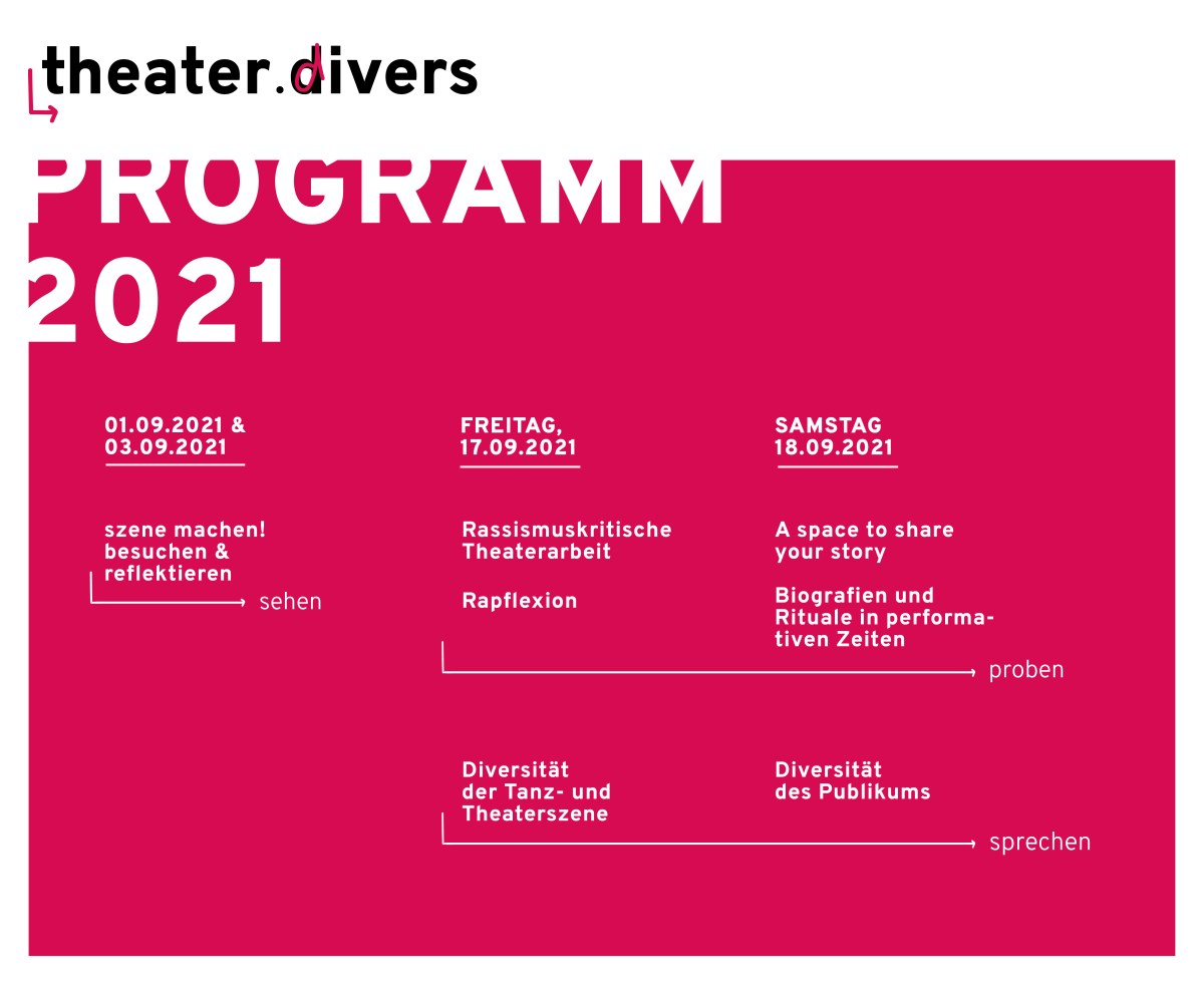Die Veranstaltungsreihe theater.divers regte im September 2021 Austausch und Selbstreflektion unter Künstler:innen und Publikum zum Thema Diversität in der Tanz- und Theaterszene an. Gemeinsam setzten wir uns kritisch mit Inhalten und Formen der darstellenden Künste auseinander.