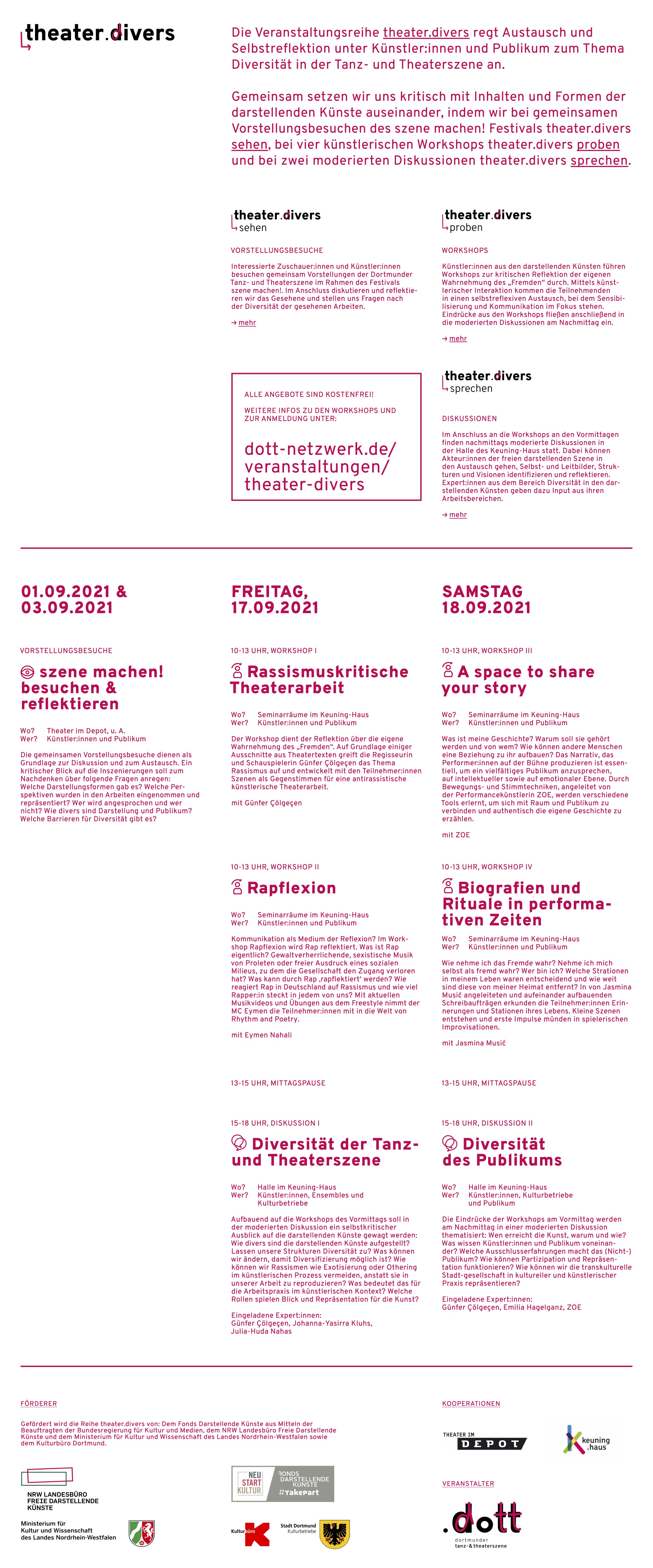 Aus den Impulsen der theater.divers-Reihe hat sich eine AG Diversität gebildet, die sich der Konzeption eines Folgeformats in 2022 widmet. Bei Interesse an einer Beteiligung an der AG oder bei weiterführenden Fragen zum Programm, kontaktiert bitte das Leitungsteam: